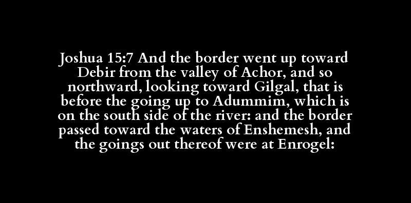 Joshua 15:7 And the border went up toward Debir from the valley of Achor, and so northward, looking toward Gilgal, that is before the going up to Adummim, which is on the south side of the river: and the border passed toward the waters of Enshemesh, and the goings out thereof were at Enrogel: