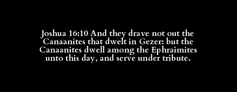 Joshua 16:10 And they drave not out the Canaanites that dwelt in Gezer: but the Canaanites dwell among the Ephraimites unto this day, and serve under tribute.