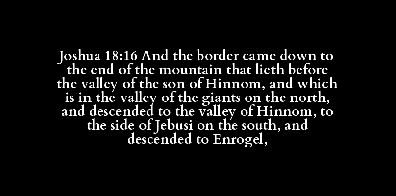 Joshua 18:16 And the border came down to the end of the mountain that lieth before the valley of the son of Hinnom, and which is in the valley of the giants on the north, and descended to the valley of Hinnom, to the side of Jebusi on the south, and descended to Enrogel,
