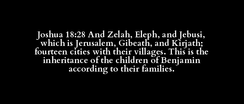 Joshua 18:28 And Zelah, Eleph, and Jebusi, which is Jerusalem, Gibeath, and Kirjath; fourteen cities with their villages. This is the inheritance of the children of Benjamin according to their families.