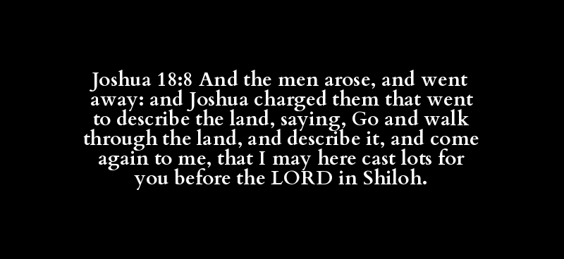 Joshua 18:8 And the men arose, and went away: and Joshua charged them that went to describe the land, saying, Go and walk through the land, and describe it, and come again to me, that I may here cast lots for you before the LORD in Shiloh.