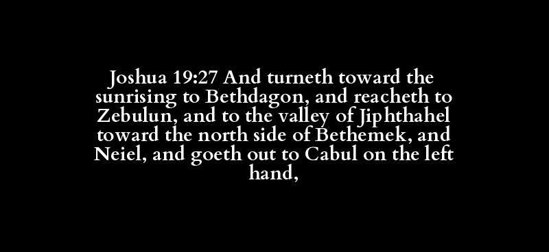 Joshua 19:27 And turneth toward the sunrising to Bethdagon, and reacheth to Zebulun, and to the valley of Jiphthahel toward the north side of Bethemek, and Neiel, and goeth out to Cabul on the left hand,