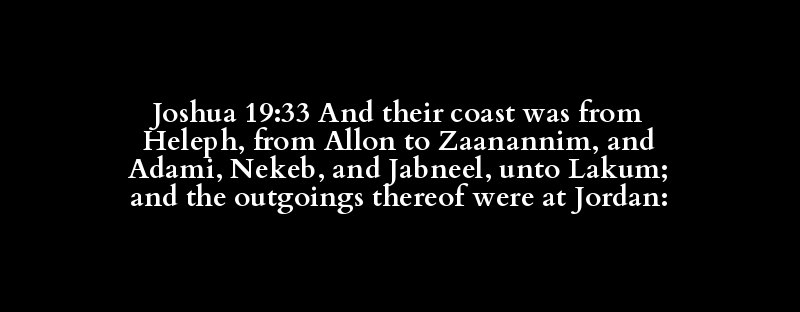Joshua 19:33 And their coast was from Heleph, from Allon to Zaanannim, and Adami, Nekeb, and Jabneel, unto Lakum; and the outgoings thereof were at Jordan: