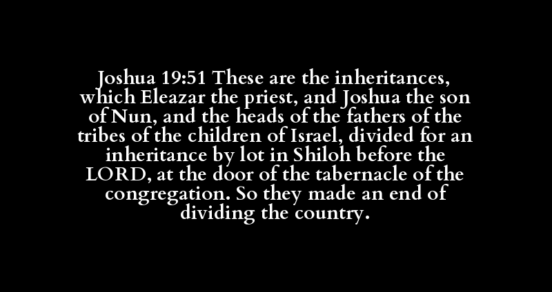 Joshua 19:51 These are the inheritances, which Eleazar the priest, and Joshua the son of Nun, and the heads of the fathers of the tribes of the children of Israel, divided for an inheritance by lot in Shiloh before the LORD, at the door of the tabernacle of the congregation. So they made an end of dividing the country.