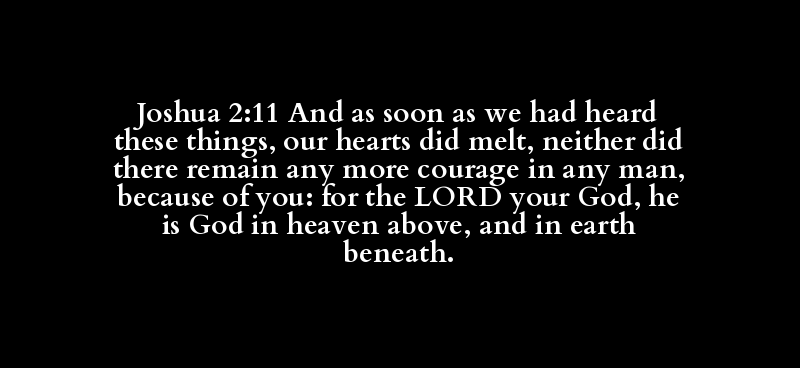 Joshua 2:11 And as soon as we had heard these things, our hearts did melt, neither did there remain any more courage in any man, because of you: for the LORD your God, he is God in heaven above, and in earth beneath.