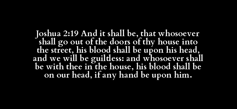Joshua 2:19 And it shall be, that whosoever shall go out of the doors of thy house into the street, his blood shall be upon his head, and we will be guiltless: and whosoever shall be with thee in the house, his blood shall be on our head, if any hand be upon him.