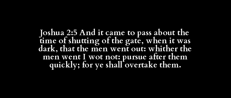 Joshua 2:5 And it came to pass about the time of shutting of the gate, when it was dark, that the men went out: whither the men went I wot not: pursue after them quickly; for ye shall overtake them.