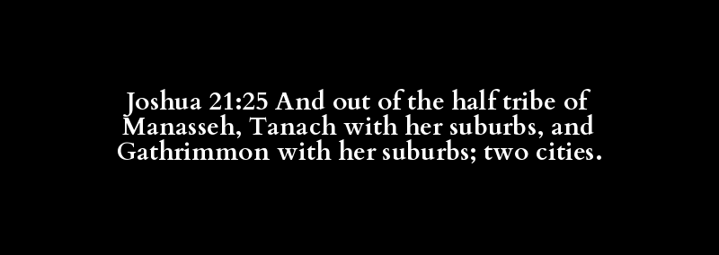Joshua 21:25 And out of the half tribe of Manasseh, Tanach with her suburbs, and Gathrimmon with her suburbs; two cities.