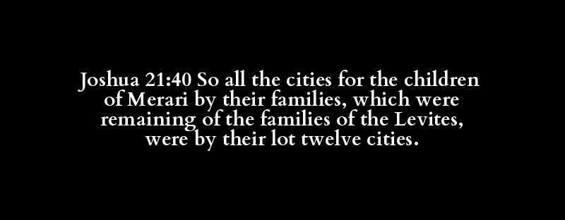 Joshua 21:40 So all the cities for the children of Merari by their families, which were remaining of the families of the Levites, were by their lot twelve cities.