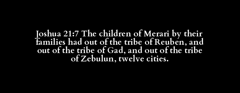 Joshua 21:7 The children of Merari by their families had out of the tribe of Reuben, and out of the tribe of Gad, and out of the tribe of Zebulun, twelve cities.