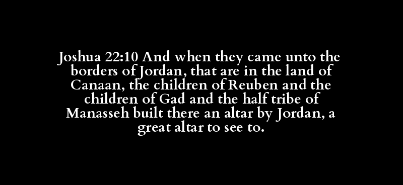Joshua 22:10 And when they came unto the borders of Jordan, that are in the land of Canaan, the children of Reuben and the children of Gad and the half tribe of Manasseh built there an altar by Jordan, a great altar to see to.