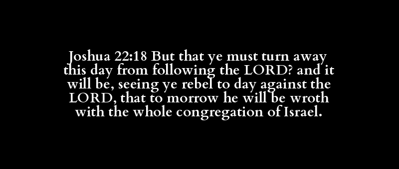Joshua 22:18 But that ye must turn away this day from following the LORD? and it will be, seeing ye rebel to day against the LORD, that to morrow he will be wroth with the whole congregation of Israel.