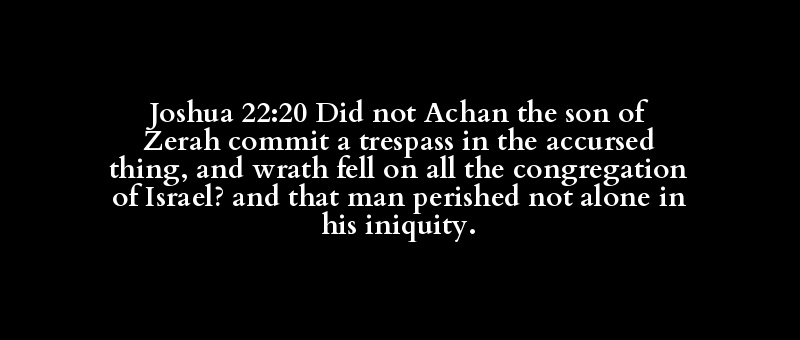 Joshua 22:20 Did not Achan the son of Zerah commit a trespass in the accursed thing, and wrath fell on all the congregation of Israel? and that man perished not alone in his iniquity.