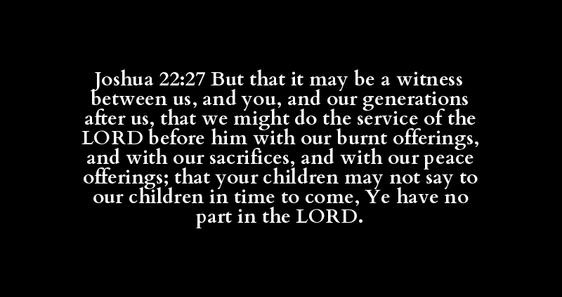 Joshua 22:27 But that it may be a witness between us, and you, and our generations after us, that we might do the service of the LORD before him with our burnt offerings, and with our sacrifices, and with our peace offerings; that your children may not say to our children in time to come, Ye have no part in the LORD.