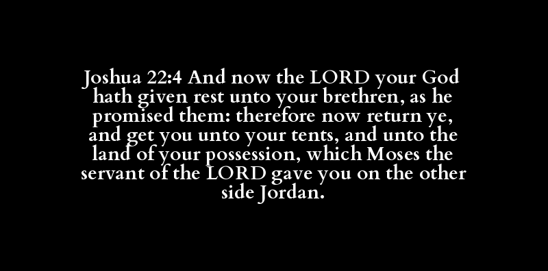 Joshua 22:4 And now the LORD your God hath given rest unto your brethren, as he promised them: therefore now return ye, and get you unto your tents, and unto the land of your possession, which Moses the servant of the LORD gave you on the other side Jordan.