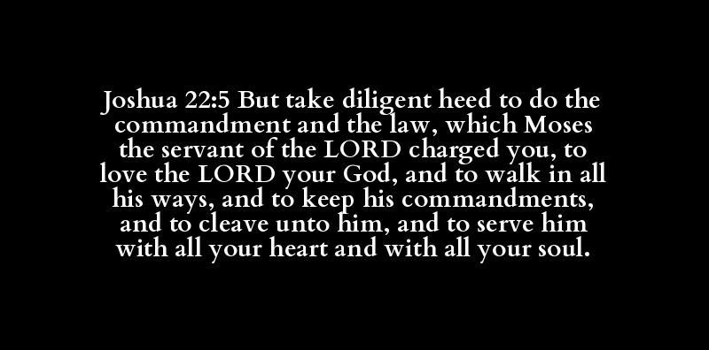 Joshua 22:5 But take diligent heed to do the commandment and the law, which Moses the servant of the LORD charged you, to love the LORD your God, and to walk in all his ways, and to keep his commandments, and to cleave unto him, and to serve him with all your heart and with all your soul.