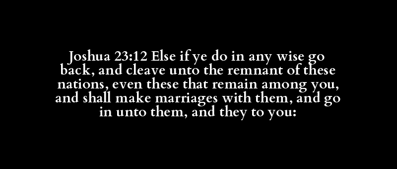Joshua 23:12 Else if ye do in any wise go back, and cleave unto the remnant of these nations, even these that remain among you, and shall make marriages with them, and go in unto them, and they to you:
