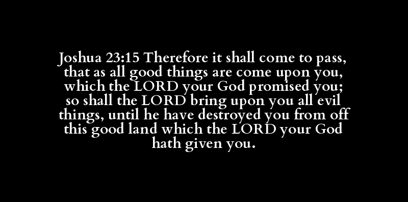Joshua 23:15 Therefore it shall come to pass, that as all good things are come upon you, which the LORD your God promised you; so shall the LORD bring upon you all evil things, until he have destroyed you from off this good land which the LORD your God hath given you.