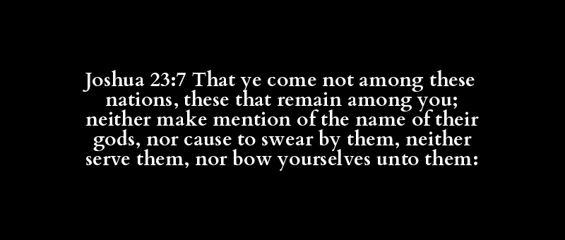 Joshua 23:7 That ye come not among these nations, these that remain among you; neither make mention of the name of their gods, nor cause to swear by them, neither serve them, nor bow yourselves unto them:
