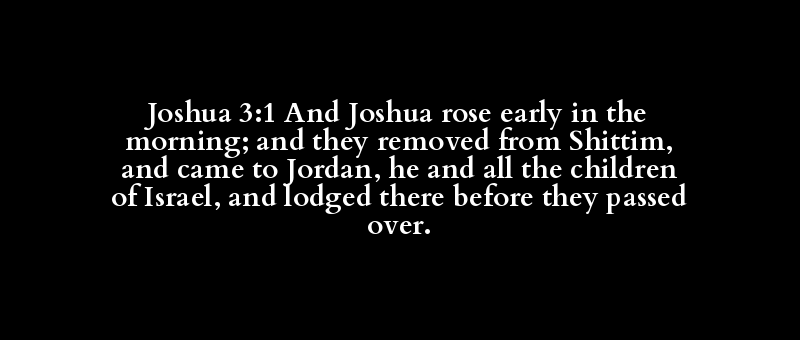 Joshua 3:1 And Joshua rose early in the morning; and they removed from Shittim, and came to Jordan, he and all the children of Israel, and lodged there before they passed over.