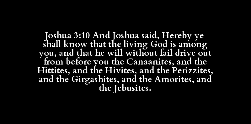 Joshua 3:10 And Joshua said, Hereby ye shall know that the living God is among you, and that he will without fail drive out from before you the Canaanites, and the Hittites, and the Hivites, and the Perizzites, and the Girgashites, and the Amorites, and the Jebusites.