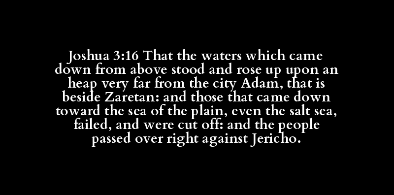 Joshua 3:16 That the waters which came down from above stood and rose up upon an heap very far from the city Adam, that is beside Zaretan: and those that came down toward the sea of the plain, even the salt sea, failed, and were cut off: and the people passed over right against Jericho.