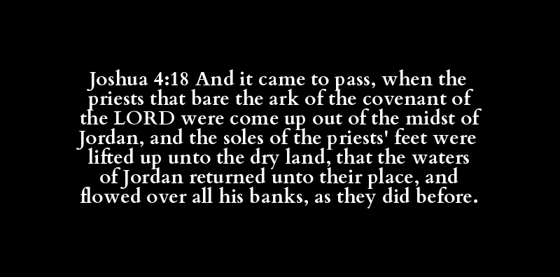 Joshua 4:18 And it came to pass, when the priests that bare the ark of the covenant of the LORD were come up out of the midst of Jordan, and the soles of the priests' feet were lifted up unto the dry land, that the waters of Jordan returned unto their place, and flowed over all his banks, as they did before.