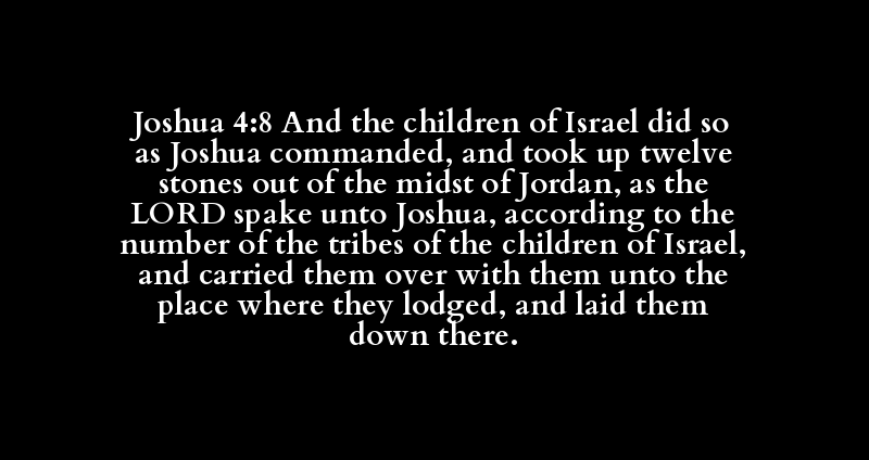 Joshua 4:8 And the children of Israel did so as Joshua commanded, and took up twelve stones out of the midst of Jordan, as the LORD spake unto Joshua, according to the number of the tribes of the children of Israel, and carried them over with them unto the place where they lodged, and laid them down there.