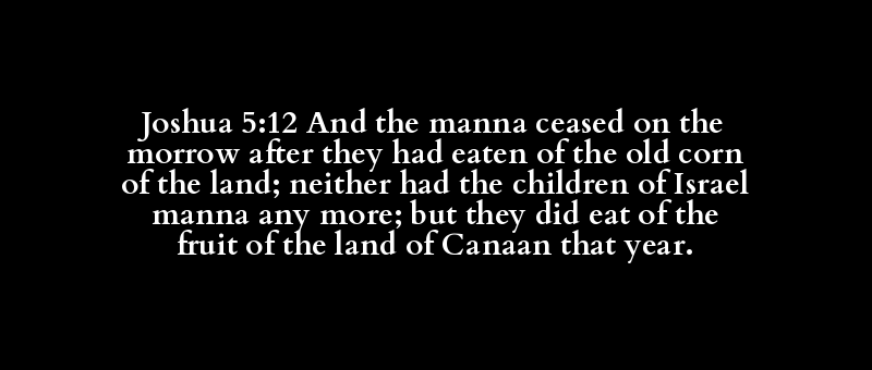Joshua 5:12 And the manna ceased on the morrow after they had eaten of the old corn of the land; neither had the children of Israel manna any more; but they did eat of the fruit of the land of Canaan that year.