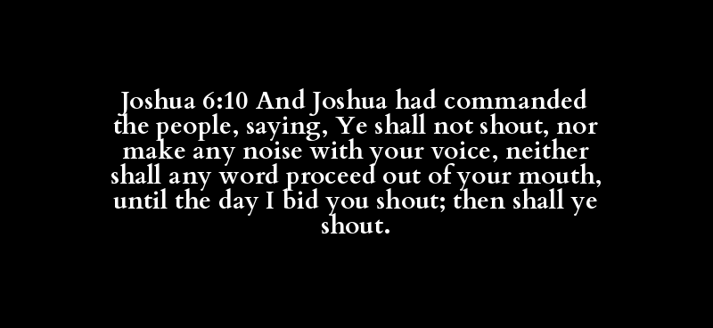 Joshua 6:10 And Joshua had commanded the people, saying, Ye shall not shout, nor make any noise with your voice, neither shall any word proceed out of your mouth, until the day I bid you shout; then shall ye shout.