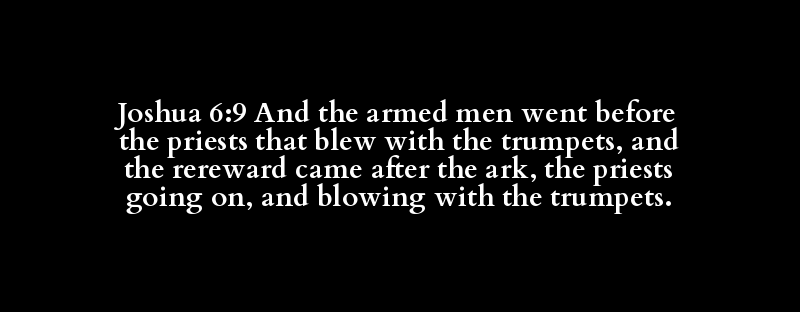 Joshua 6:9 And the armed men went before the priests that blew with the trumpets, and the rereward came after the ark, the priests going on, and blowing with the trumpets.