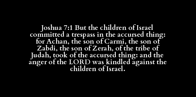 Joshua 7:1 But the children of Israel committed a trespass in the accursed thing: for Achan, the son of Carmi, the son of Zabdi, the son of Zerah, of the tribe of Judah, took of the accursed thing: and the anger of the LORD was kindled against the children of Israel.