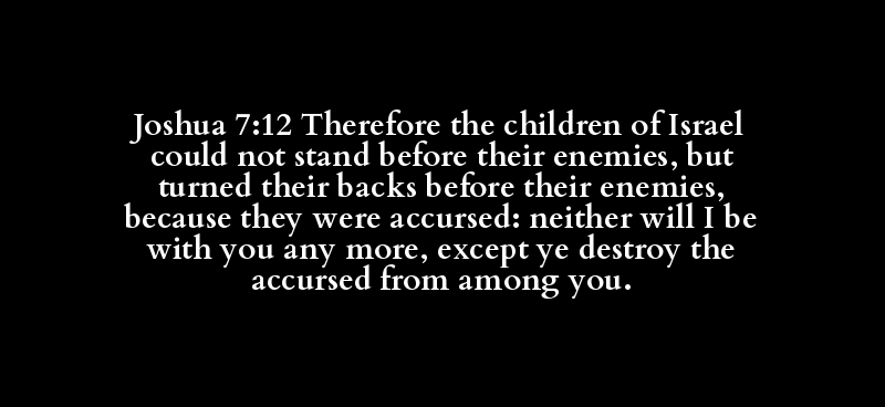Joshua 7:12 Therefore the children of Israel could not stand before their enemies, but turned their backs before their enemies, because they were accursed: neither will I be with you any more, except ye destroy the accursed from among you.