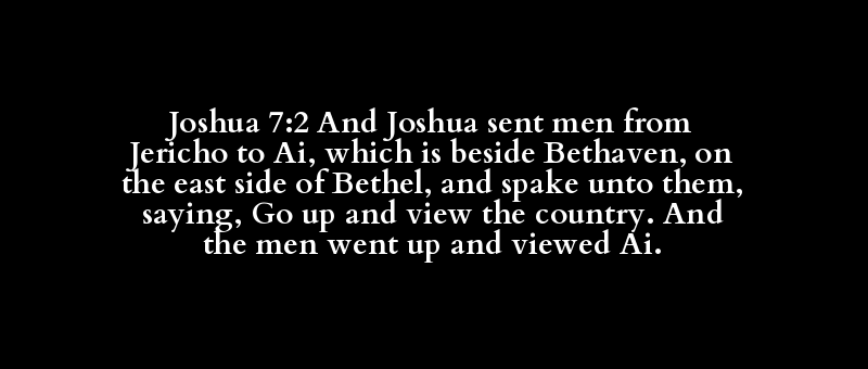 Joshua 7:2 And Joshua sent men from Jericho to Ai, which is beside Bethaven, on the east side of Bethel, and spake unto them, saying, Go up and view the country. And the men went up and viewed Ai.