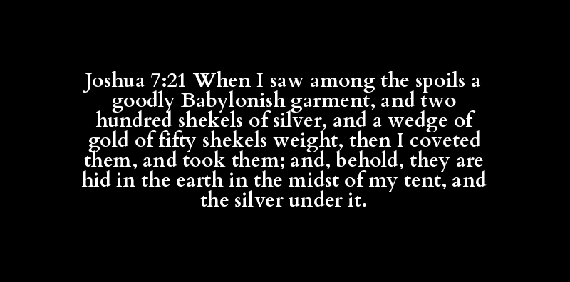 Joshua 7:21 When I saw among the spoils a goodly Babylonish garment, and two hundred shekels of silver, and a wedge of gold of fifty shekels weight, then I coveted them, and took them; and, behold, they are hid in the earth in the midst of my tent, and the silver under it.