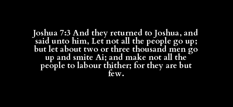 Joshua 7:3 And they returned to Joshua, and said unto him, Let not all the people go up; but let about two or three thousand men go up and smite Ai; and make not all the people to labour thither; for they are but few.