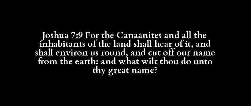 Joshua 7:9 For the Canaanites and all the inhabitants of the land shall hear of it, and shall environ us round, and cut off our name from the earth: and what wilt thou do unto thy great name?