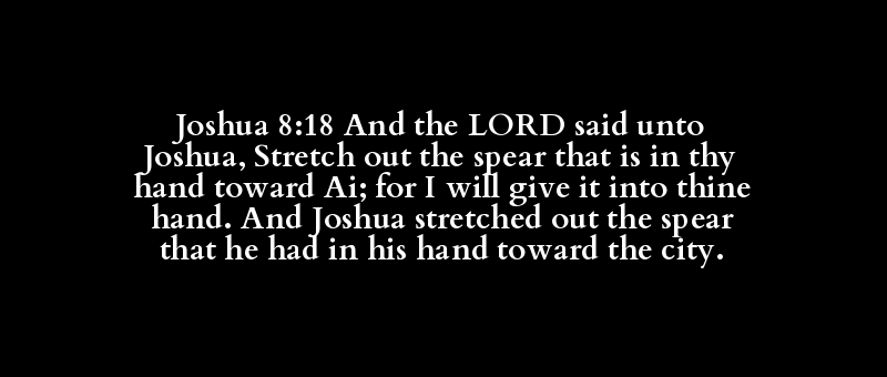 Joshua 8:18 And the LORD said unto Joshua, Stretch out the spear that is in thy hand toward Ai; for I will give it into thine hand. And Joshua stretched out the spear that he had in his hand toward the city.