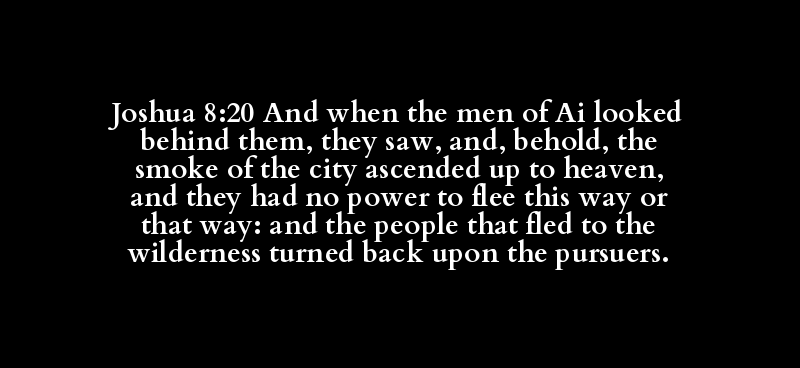 Joshua 8:20 And when the men of Ai looked behind them, they saw, and, behold, the smoke of the city ascended up to heaven, and they had no power to flee this way or that way: and the people that fled to the wilderness turned back upon the pursuers.