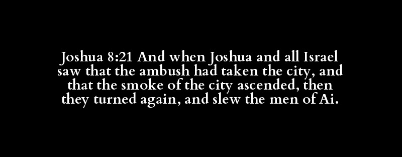Joshua 8:21 And when Joshua and all Israel saw that the ambush had taken the city, and that the smoke of the city ascended, then they turned again, and slew the men of Ai.