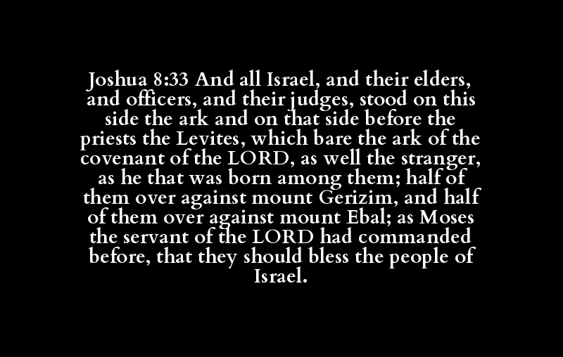 Joshua 8:33 And all Israel, and their elders, and officers, and their judges, stood on this side the ark and on that side before the priests the Levites, which bare the ark of the covenant of the LORD, as well the stranger, as he that was born among them; half of them over against mount Gerizim, and half of them over against mount Ebal; as Moses the servant of the LORD had commanded before, that they should bless the people of Israel.