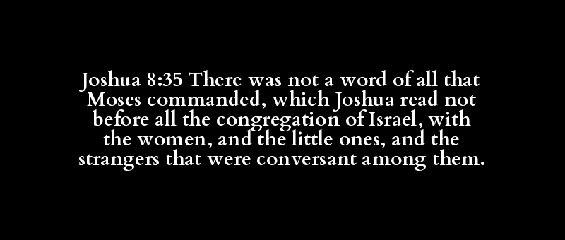 Joshua 8:35 There was not a word of all that Moses commanded, which Joshua read not before all the congregation of Israel, with the women, and the little ones, and the strangers that were conversant among them.