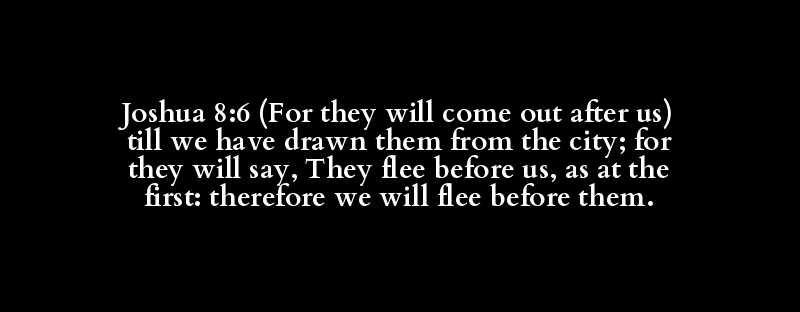 Joshua 8:6 (For they will come out after us) till we have drawn them from the city; for they will say, They flee before us, as at the first: therefore we will flee before them.