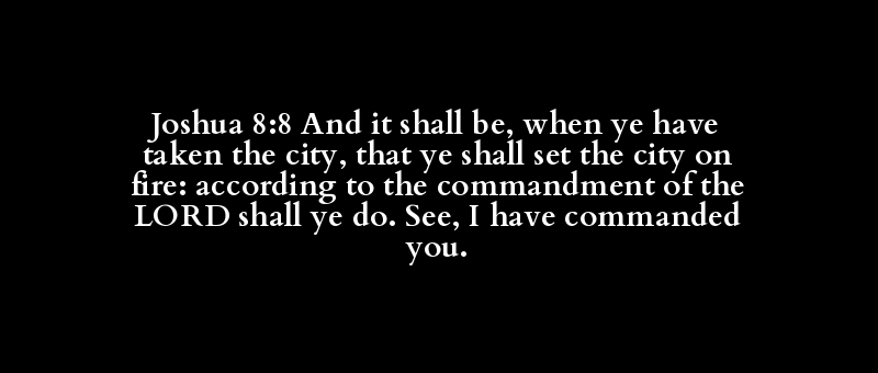 Joshua 8:8 And it shall be, when ye have taken the city, that ye shall set the city on fire: according to the commandment of the LORD shall ye do. See, I have commanded you.
