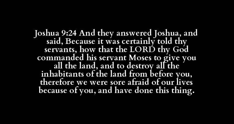 Joshua 9:24 And they answered Joshua, and said, Because it was certainly told thy servants, how that the LORD thy God commanded his servant Moses to give you all the land, and to destroy all the inhabitants of the land from before you, therefore we were sore afraid of our lives because of you, and have done this thing.