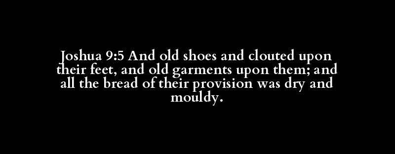 Joshua 9:5 And old shoes and clouted upon their feet, and old garments upon them; and all the bread of their provision was dry and mouldy.