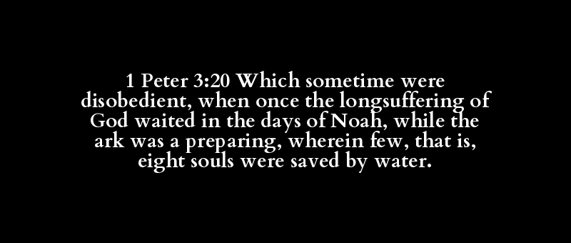 1 Peter 3:20 Which sometime were disobedient, when once the longsuffering of God waited in the days of Noah, while the ark was a preparing, wherein few, that is, eight souls were saved by water.