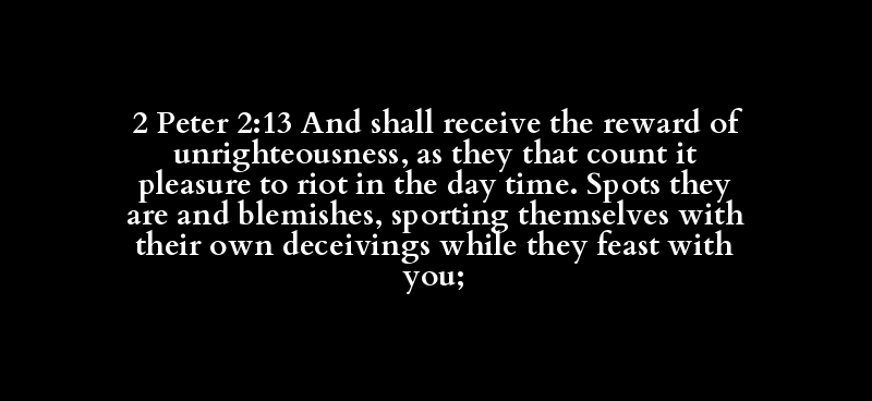 2 Peter 2:13 And shall receive the reward of unrighteousness, as they that count it pleasure to riot in the day time. Spots they are and blemishes, sporting themselves with their own deceivings while they feast with you;