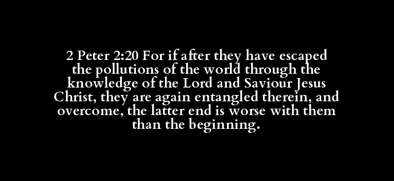 2 Peter 2:20 For if after they have escaped the pollutions of the world through the knowledge of the Lord and Saviour Jesus Christ, they are again entangled therein, and overcome, the latter end is worse with them than the beginning.