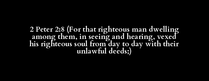 2 Peter 2:8 (For that righteous man dwelling among them, in seeing and hearing, vexed his righteous soul from day to day with their unlawful deeds;)
